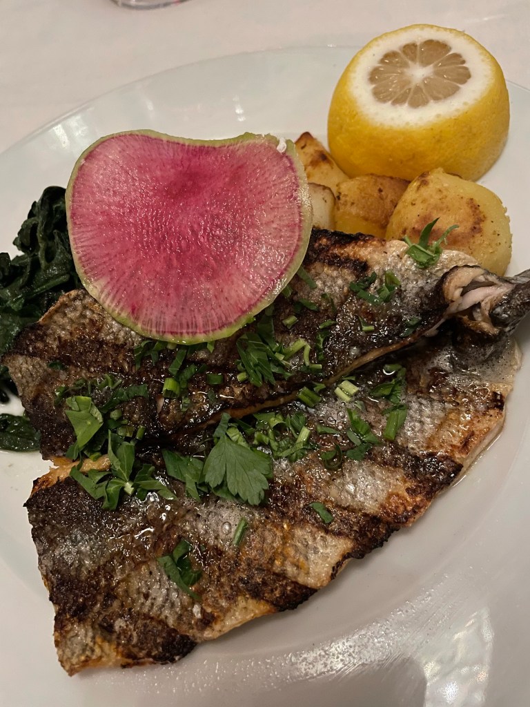 Pam chose the Branzino which is available roasted, grilled aquapazza or fried. Aquapazza is Italian for ‘crazy water’ and in Italian cuisine refers to poached white fish. The branzino was then grilled and topped with lemon, sea salt and evoo. It was perfectly prepared and moist on the inside. The use of lemon and olive oil brightened the flavors. It was a simple dish that let the star of the dish shine.