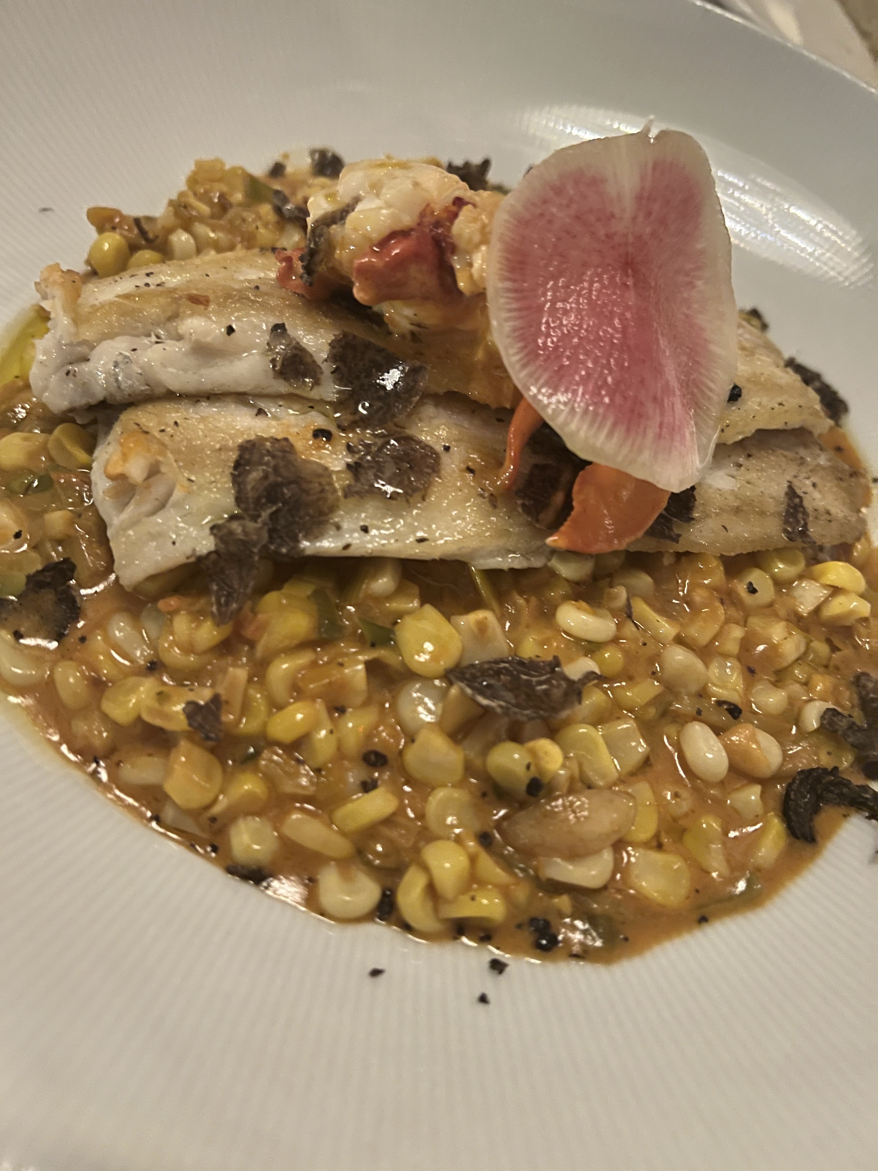 To round out our meal, we selected two great fish dishes. Jeff chose from the Truffle Menu – the Adriatic Sea Bass. It is served on a bed of charred corn with creme, then topped with black truffles and lobster. The sea bass was tender with just a hint of natural sweetness. Adding in the truffle made this dish a must try.