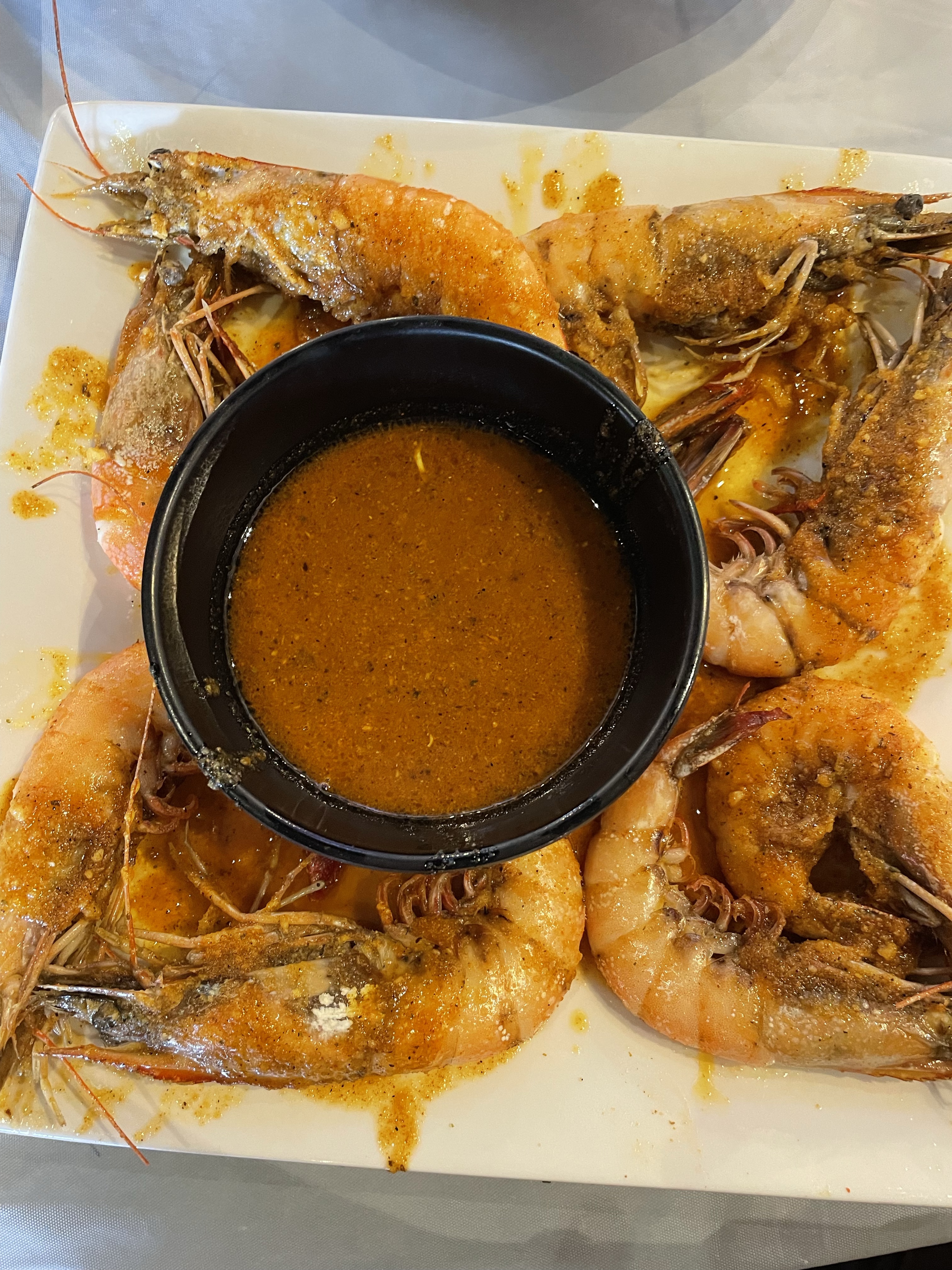 We ordered a pound of shrimp, medium spice, which is served head on. The size of the shrimp was impressive and they were very good, albeit slightly overcooked, making them harder to peel. Served with a great dipping sauce to increase the overall flavor, we enjoyed them.