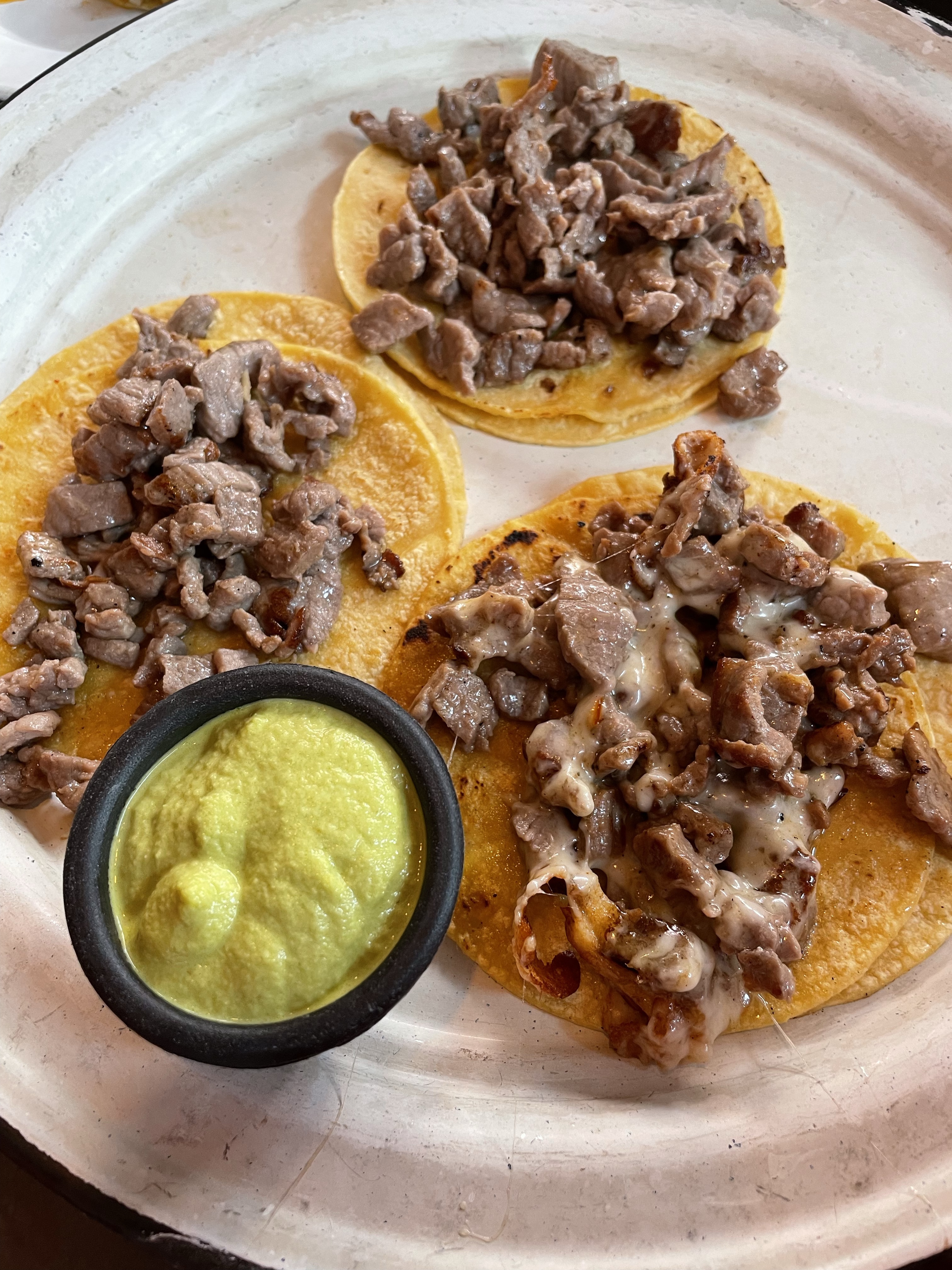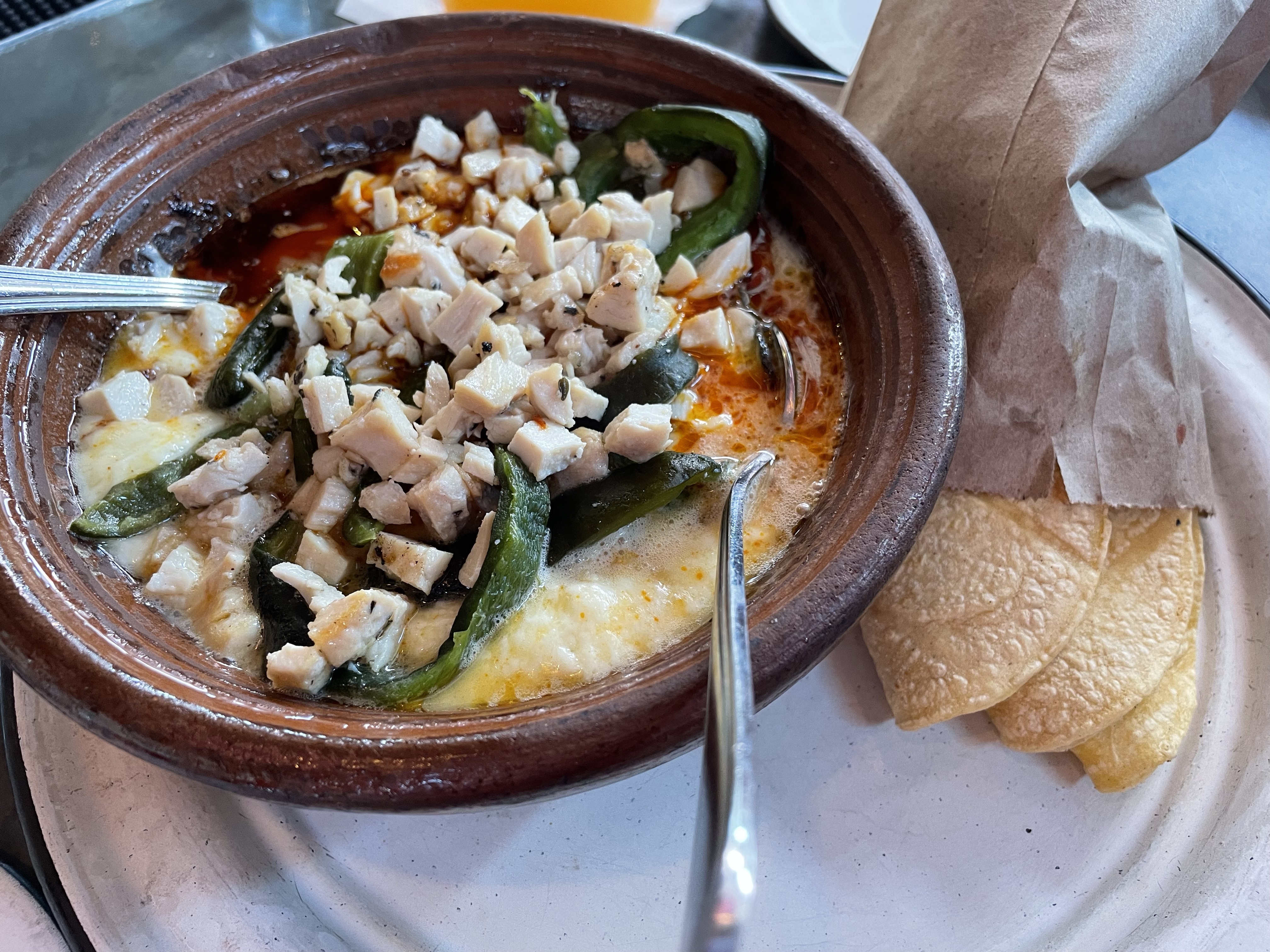 To top off our meal, we ordered their beef tacos (left) and the Queso de Fogata (right). The tacos were simple with corn tortillas, tender beef and a bright yet spicy salsa. The Queso de Fogata is a great mix of melted cheese, poblano pepper slices and pepper oil in a hot bowl. We had them add chicken, and the dish was Jeff’s favorite of the day. Served with fresh corn tortillas, this a throwback to the great food he grew up with in San Antonio. It would also be the perfect cure for a hangover.