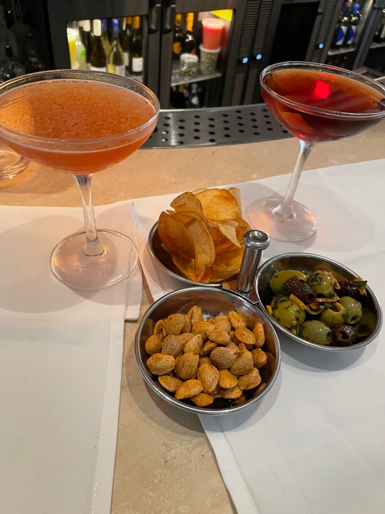 We sat at the bar (our normal) and were greeted by both bartenders who were friendly and personable. The cocktails were well-balanced and quite good. Pam had the Paper Plane (High West bourbon, aperol, amaro montenegro & lemon), and Jeff had the Quattro Dita (Redemption rye, campari, cynar & sween vermouth). While enjoying the cocktails, they served a snack mix including house-made chips and Marcona almonds, but Jeff’s favorite was the mixed olives with a bit of lemon rind for an added flavor pop.