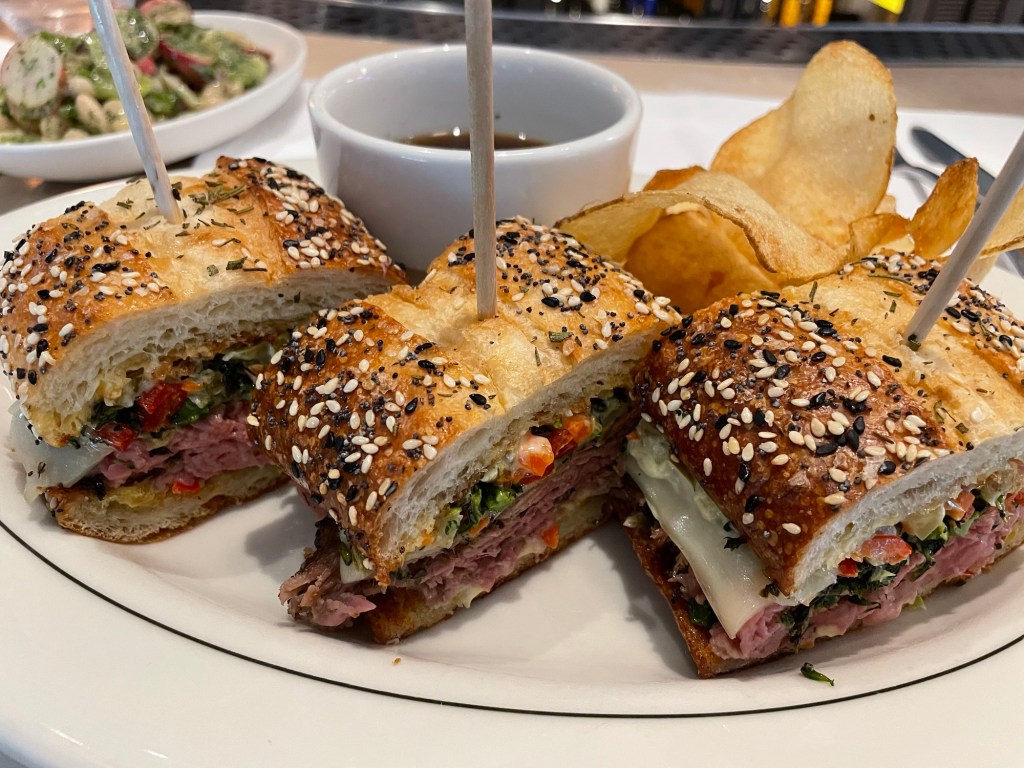 Pam noticed the Plaza Salad on the menu during our first visit, noting it had some of her favorite things. It did not disappoint with roasted chicken, golden beets, pancetta, marcona almonds, goat cheese and honey vinaigrette. A fantastic salad, and one that has been added to her list of favorites. Jeff decided to not be as healthy and ordered the Italian Dip, their take on a French dip with shaved tri-tip, melted provolone, sauteed broccolini and giardiniera spread. The tri-tip was tender and flavorful, and once dipped into the au jus, it was perfection.