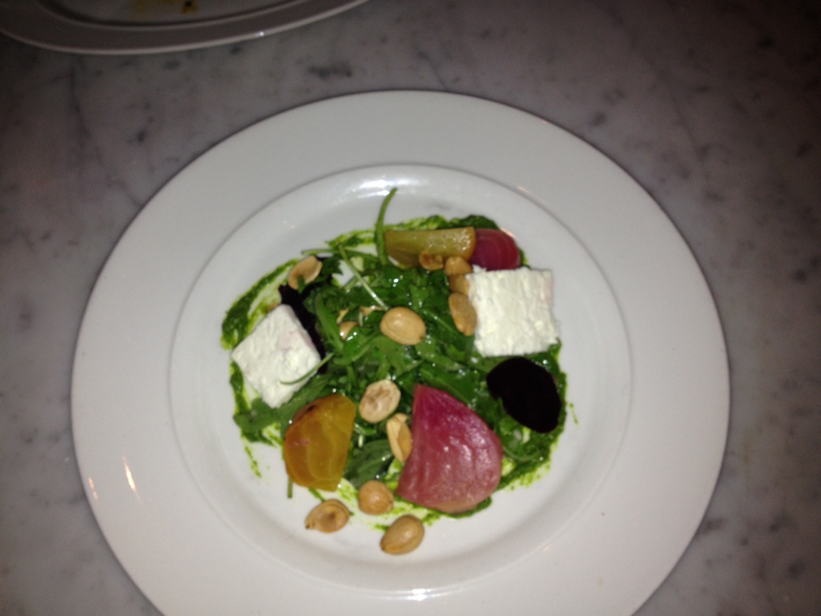 Next, we moved on to Roasted Beets served with spring onion pesto, local goat feta, almonds, arugula and a horseradish vinaigrette. This was a much better dish and Pam simply loved it due to her love of beets and goat cheese.