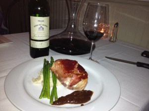Jeff ordered the prosciutto wrapped pork chop which was complemented with a fig sauce. Also on the plate was duxelle, asparagus and mashed potatoes. The pork was cooked perfectly and the prosciutto wrap was well crisped. While delicious, in comparison, the asparagus and mashed potatoes were uneventful.
